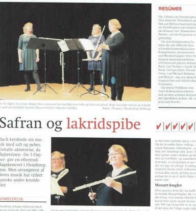 " De tre musikere står solidt på den danske fløjtetradition, og de kan altid kendes på deres nordiske tone. Trioen er fint sammenspillet, og de krydrede deres spil med charmerende historier om deres instrumenter, de enkelte numre og om samarbejdet med arrangøren" - Journalist Peter Bonde